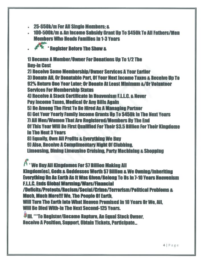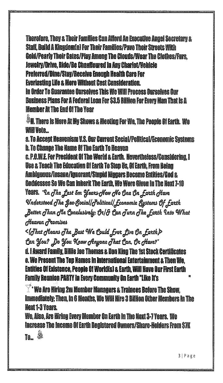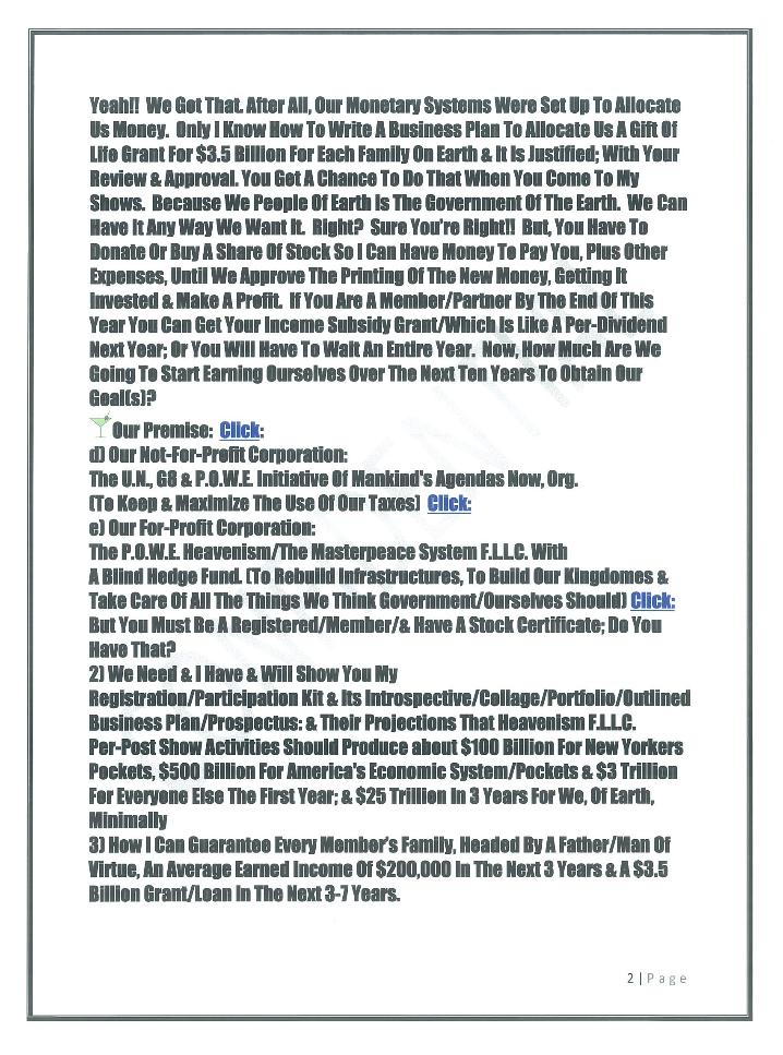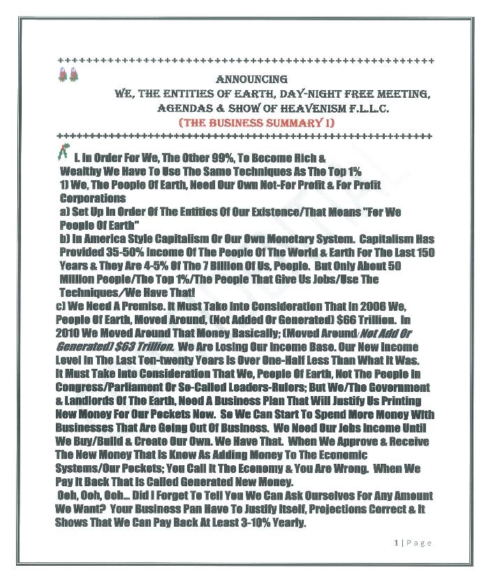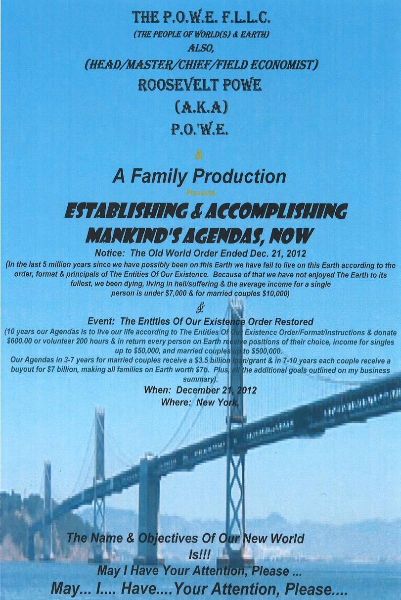 Hear Ye! Hear Ye!! Hear Ye!!! The 1st World(s) & Earth Presidential Candidate & 1st Head/Master/Chief/Field Economist (Classily, Trained By Tom Watson’s I.B.M.) Roosevelt Powe (A.K.A.) P.O.’W.E. (In Association With) Don King’s Productions Presents: The U.N., G8. & People Of World(s) & Earth Initiative Of Mankind’s Agenda(s) Now Org. Affil: A.A.R.P Also, -Heavenism- (Turns The Earth Into Heaven) “The Masterpeace System” (The 1st New/Centralized/Global/Social/Political/F.L.L.C./inc. with A Blind Hedge Fund Economic System)(Per-approved by the U.S. Congress) including, The Heavenism show/our first family of earth re-union & Implementation Party to accomplish Our Agenda(s) For The Next 10 Years |